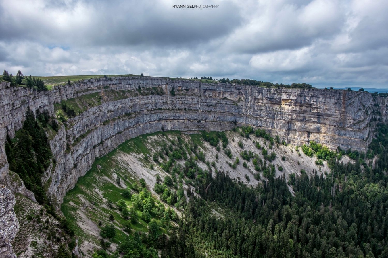 “Creux du Van”, a natural rock arena of immense proportions, is located at the border of the cantons of Neuenburg and Vaud. Impressive 160 meter high vertical rock faces surround a four kilometer long and over one kilometer wide valley basin.