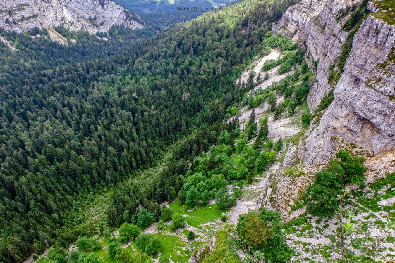 First the glaciers, then the brooks have shaped the breathtaking rock formation from the 200 million year old lime deposits of a prehistoric ocean. The steep rock faces afford detailed insight into the geology of the Jurassic folding.