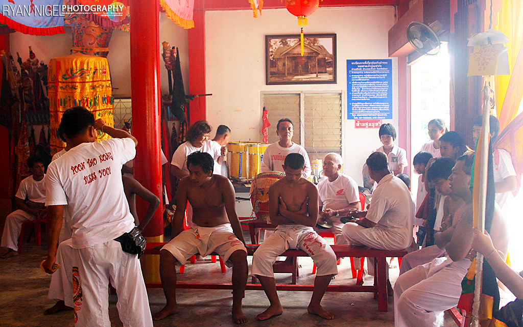 Masong ม้าทรง are the people who invite the spirits of gods to possess their bodies. Ma ม้า is the word for horse in Thai, and the name masong refers to how the spirits of the gods use the bodies of these people as a vehicle, as one rides a horse. Only pure, unmarried men or women without families of their own can become masong. At the temple they undergo a series of rituals to protect them for the duration of the festival, during which flagellation and self-mutilation is practiced. The masong tradition doesn’t exist in China and is believed to have been adopted from the Indian festival of Thaipusam.