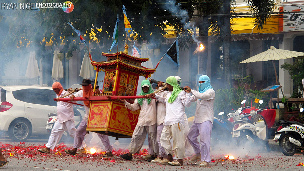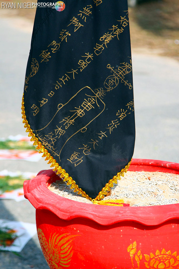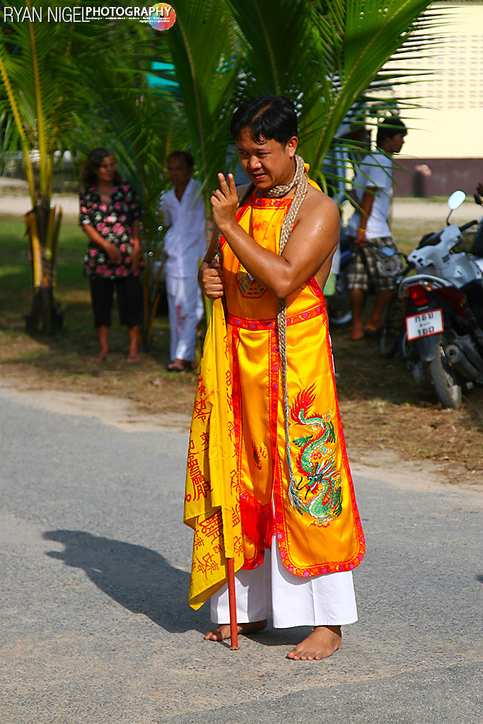 The festivities in Phuket include a procession of masong wearing elaborate costumes who pierce their cheeks and tongues with all manner of things, including swords, banners, machine guns, table lamps, and flowers. While the face is the most common area pierced, some also pierce their arms with pins and fishhooks. Teams of people accompany the masong to keep their wounds clean and to help support the heavier piercings. It is believed that while they are possessed the masong will not feel any pain. They can also be seen shaking their heads back and forth continually, and usually do not seem to “see” their surroundings. At the temple during the festival there is also firewalking and blade-ladder climbing. While large crowds of people gather to watch, the entranced mah song distribute blessed candy and pieces of orange cloth with Chinese characters printed on them yang ยังต์ for good luck. (text: Wikipedia)